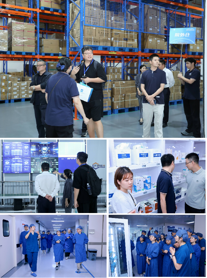 圆桌讨论结束后,探访活动进入到“品味新场景”环节。参访团分两组深入院内与院外场景。院内组走访中心周转库、手术室、泌尿外科与神经外科,体验智能柜取货、手术套包配送与骨科耗材追溯;院外组探访SPD物流中心,观摩云仓验收与统一配送全链路。参访中,嘉宾与管理人员深度交流,将理论与实景融合,感知“全链条合规、全流程可溯、多院区协同”的落地成效。