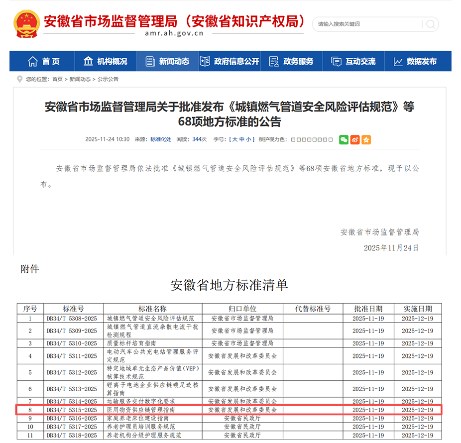 近日,经安徽省市场监督管理局批准,由安徽中技国医医疗科技股份有限公司作为第一起草单位牵头制定的《医用物资供应链管理指南》(DB34/T 5315-2025)正式发布,将于2025年12月19日起实施。此项标准成功将企业的前沿实践凝炼为全省共识,不仅彰显了国医科技在行业内的技术领导力,也标志着安徽省在构建现代化、标准化医疗机构物资管理体系方面取得了实质性进展,为行业高质量发展提供了标准指引。